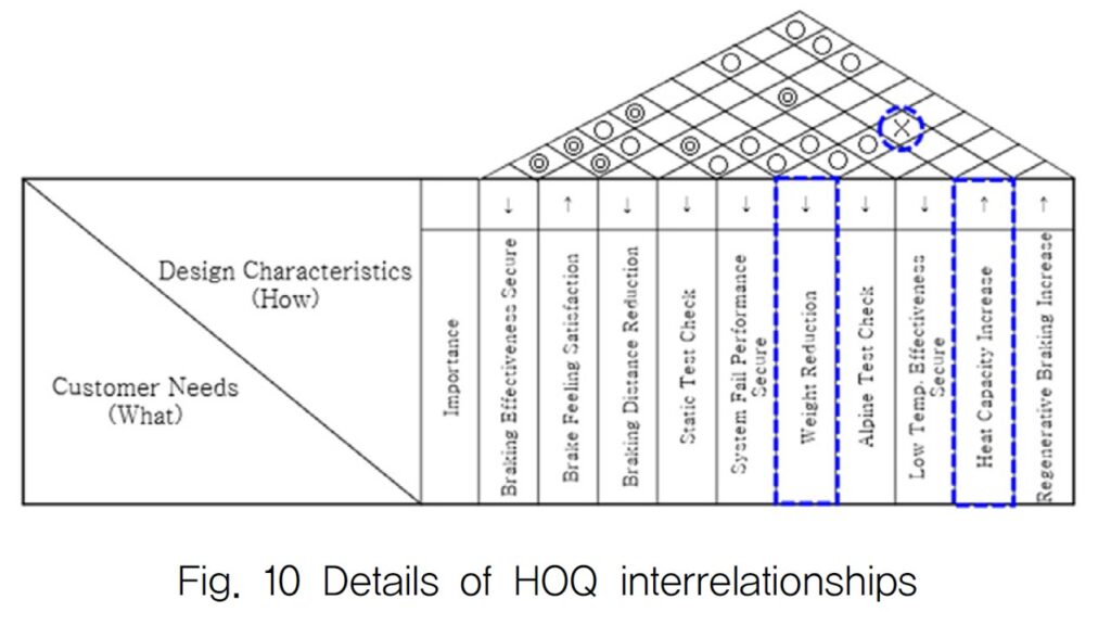 이와 같은 HOQ 작성 절차를 통하여 수립된 복합재 제동시스템에 대한 고객요구와 설계특성간의 상관강도 매트릭스 결과를 Fig. 4에 도시하였다.