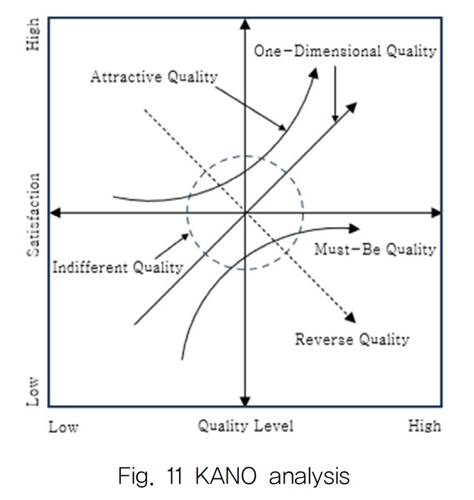KANO 분석에 의하면 제품의 품질은 일차원적 품질, 당연적 품질, 매력적 품질로 크게 구분된다.