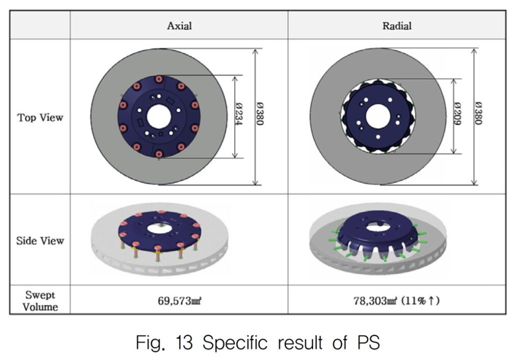 아래의 Fig. 13은 PS의 구체적인 설계 결과를 나타내고 있다. 도시된 바와 같이 복합재 디스크의 체결 구조를 축방향에서 반경방향으로 변경 하였으며, 이를 통해서 중량 저감 및 열용량 증대와 관련한 제동 마찰면이 11% 개선된 효과를 얻을 수 있었다.(13)