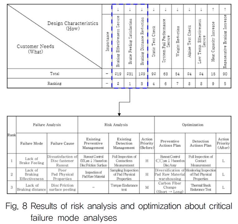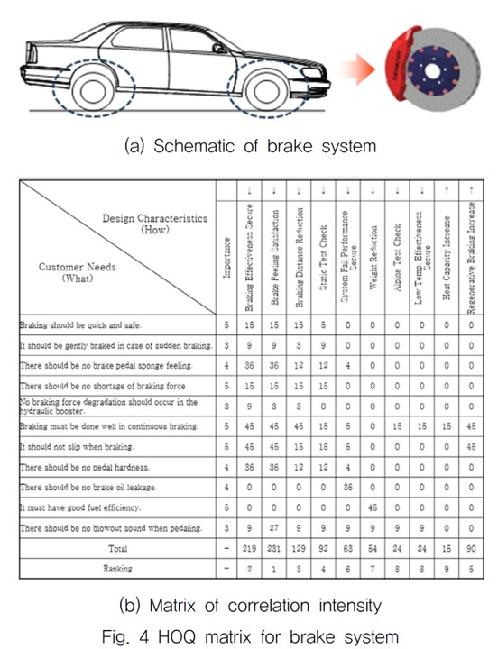 먼저, Fig. 8의 순위를 보면 제동감 만족, 효력 확보, 제동거리 축소가 전체 1, 2, 3위를 나타내고 있다. 이는 전체 고객요구 중에서 가장 영향력이 큰 설계특성을 나타낸다.