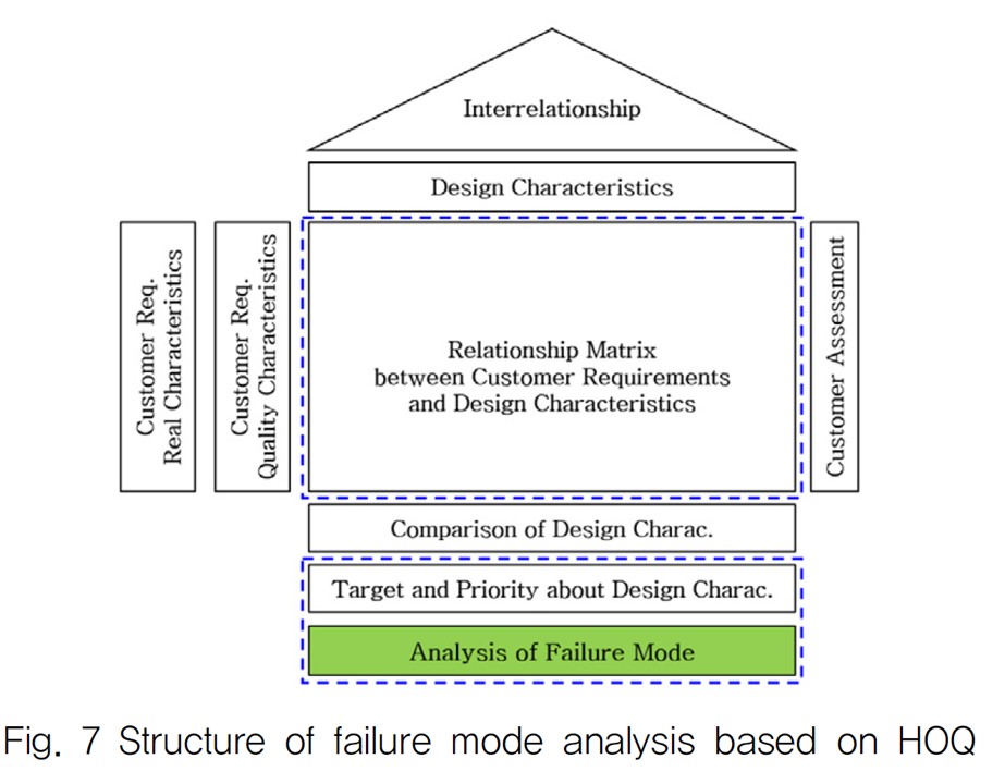 본 장에서는 3장의 HOQ 결과를 기반으로 하여 고장모드 분석을 실시하고자 한다. 아래의 Fig. 7은 HOQ를 기반으로 고장모드를 분석하기 위한 HOQ의 구조를 나타내고 있다.