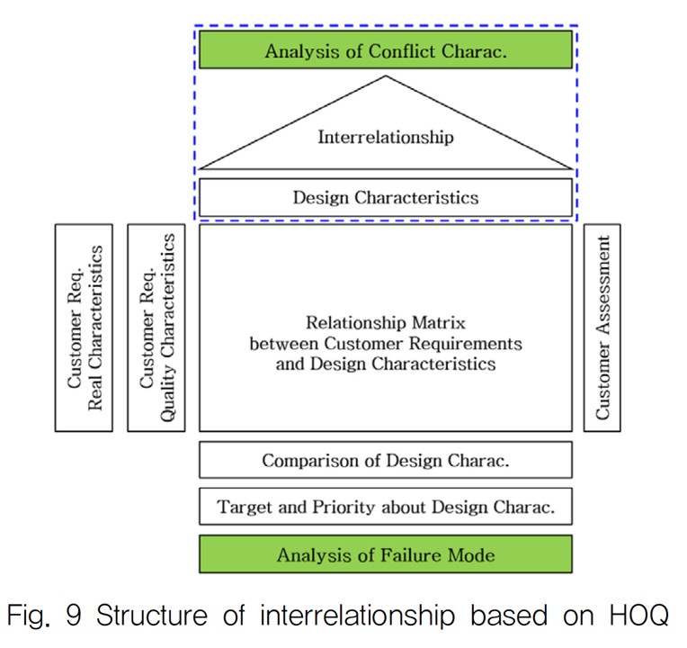 위와 같이 상충특성 분석을 추가하여 재확장된 HOQ 구조를 제시한 이유는 설계특성간 상호관계 분석을 통하여 파악한 상충되는 기술적 모순 문제점을 해결함으로써 기존 FMEA의 가장 큰 단점인 단일 고장모드에 한정된 분석을 극복하여 제품의 품질 향상과 개발 효율성을 극대화하기 위함이다.