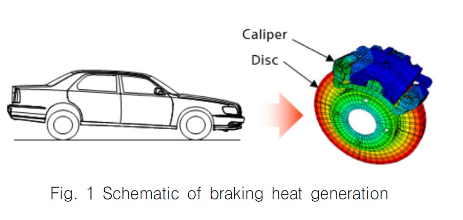 제동시스템은 아래의 Fig. 1에 도시된 바와 같이 캘리퍼(Caliper)에 내제된 마찰재와 디스크(Disc)의 상호 마찰 메커니즘(Mechanism)을 이용하여 차량의 운동에너지를 열에너지로 전환하여 차속을 저감시키는 장치이다.