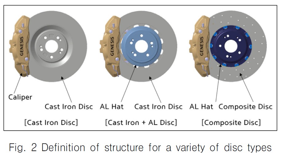 주철 디스크, 주철-알루미늄 이종 접합 디스크 그리고 복합재 디스크가 현재까지 사용 중인 디스크의 종류이며, 3가지 디스크 모두 개발 목적 및 현가시스템과 같은 주변 시스템들과의 관계에 의하여 적용 되는 차종은 다소 상이 하더라도 기본적으로 구성되는 비마찰면에 대한 설계는 동일한 조건을 나타내고 있음을 확인할 수 있었다.