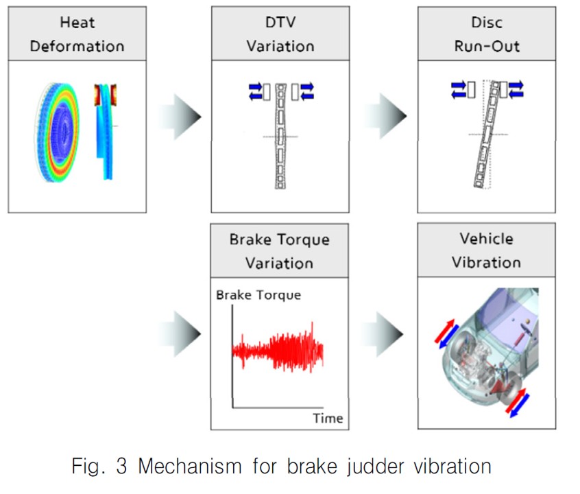 한편, 아래의 Fig. 3은 저더 진동 발생에 대한 개념도를 나타내고 있다. 저더 진동은 과도한 제동 열부하에 따른 디스크의 열변형과 직접적인 관계를 갖고 있으며, DTV(Disc Thickness Variation)와 디스크 런아웃(Run-Out)의 변화를 순차적으로 야기시켜 최종 BTV(Brake Torque Variation)의 변화에 의하여 차량의 이상 진동을 발생하게 된다.