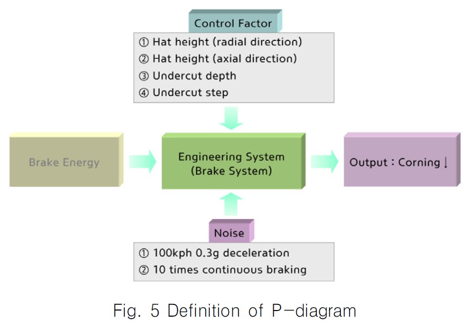 2장의 이상 기능 검토에 이어서 P-diagram을 검토하여 제동시스템의 입력, 출력, 제어 요인 및 잡음 요인을 도식화 하였다. 아래의 Fig. 5는 이와 같은 검토를 통하여 수립된 P-diagram을 나타내고 있다.