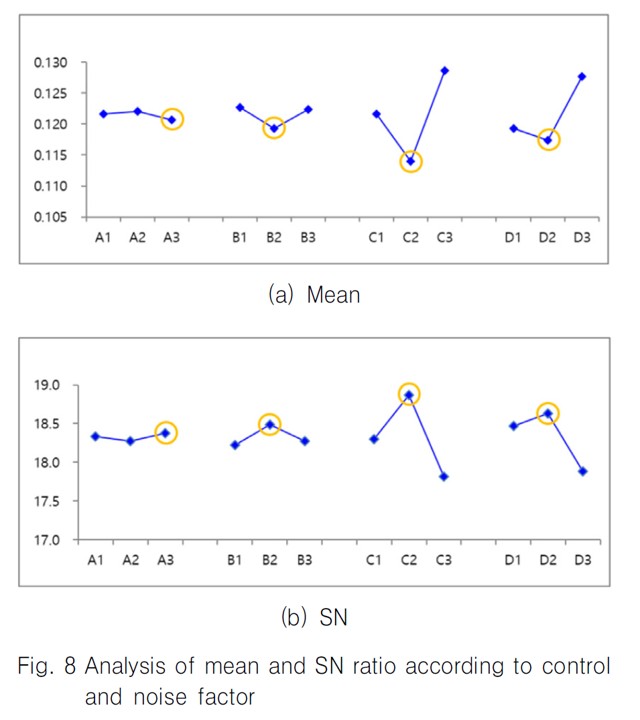 실험계획법을 통해서 수집된 계측 데이터에 대하여 출력 반응 분석을 실시하였다. Fig. 8은 제어 요인의 수준별 평균과 SN비의 반응 결과를 나타내고 있다.