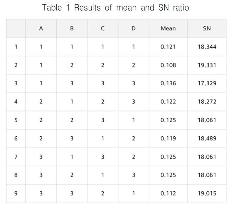 한편, Table 1은 전체 실험을 통한 평균 및 SN의 출력 반응 결과를 나타내고 있다.