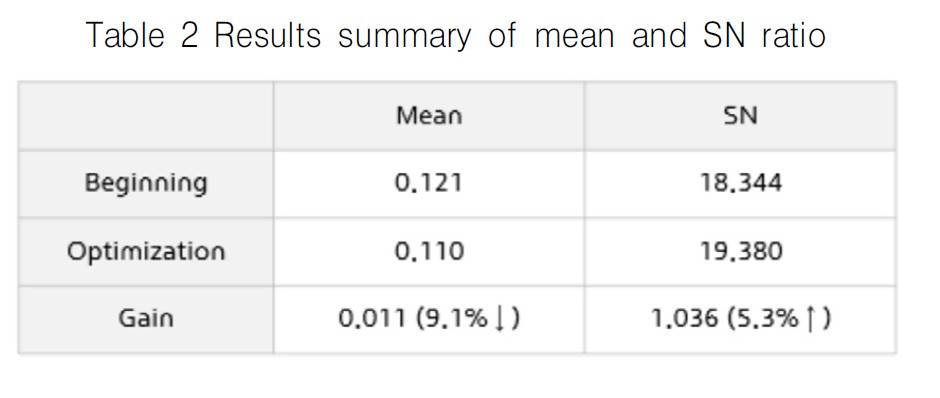 한편, 아래의 Table 2에 평균과 SN비의 상대 비교를 위하여 초기 사양과 최적화 사양의 결과값을 도시하였다.