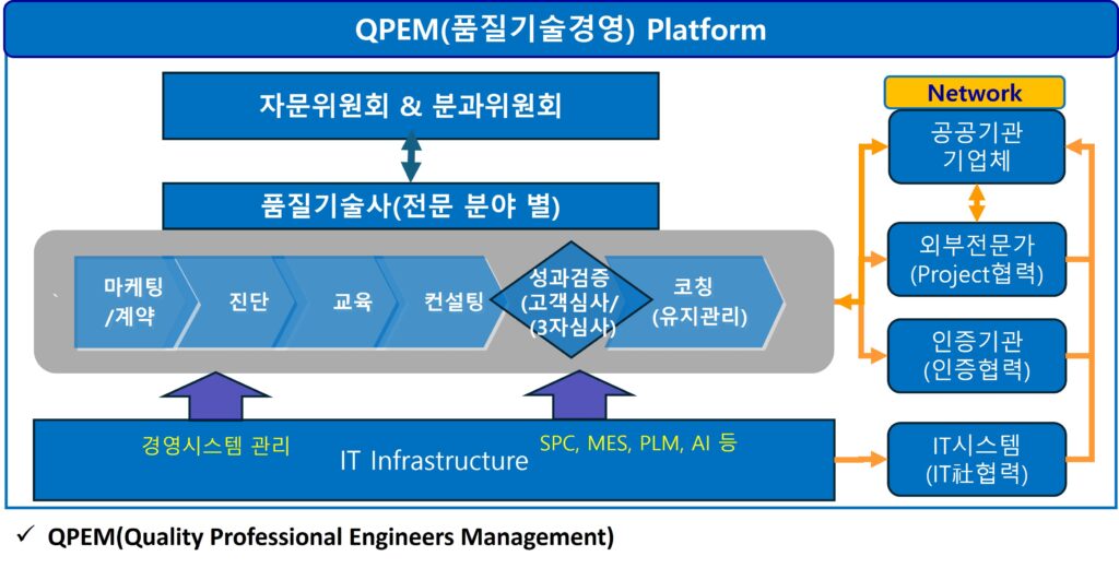 Platform (사)한국품질기술사회 Platform 운영 Platform은 사업분야별로 품질기술사가 참여하고 전문분야별로 업체 진단, 교육, 컨설팅, 성과검증, 코칭 등 업무를 수행합니다.자문위원회의 분과 별로 전문성, 공공성, 신뢰성을 확보하기 위하여, 품질기술사 중 신망있는 최고전문가가 참여하는 전략 자문 기구를 운영합니다.필요한 경우에는 외부 전문가와 Project별로 협업하여 성과를 창출합니다.품질기술사와 외부 전문가 Group이 함께 공동 진행을 하여 성공적인 고객만족을 이끌어내는 Platform을 운영합니다. 자문위원회 한국품질기술사회 자문위원회는 품질기술경영 Platform의 전문성·공공성·신뢰성을 강화하기 위하여 품질기술사 중 신망있고, 전문성이 있는 최고 전문가들이 참여하는 전략 자문기구입니다.자문위원회는 품질기술사의 현장 실행을 지원하며, 중장기 방향 설정과 사업의 적합성·타당성·지속가능성을 자문함으로써 한국품질기술회 운영 전반의 신뢰성 및 전문성 향상에 기여합니다. 분과위원회 분과위원회는 사업을 직접 수행하는 조직이 아니라, 전략·검증·연계 중심의 독립적 위원회 기구로 운영하여 공정성·객관성·전문성을 확보한 품질기술경영 체계를 구축.분과위원회는 정기 또는 수시로 운영사업 규모 및 특성에 따라 분야별 전문가 참여 지원분과위원회 결과는 사업 수행 조직 및 품질기술사에게 공유되어 실제 현장 실행과 개선에 반영분과위원회는 독립성과 공정성을 유지책임 있는 분과위원회 활동을 수행 품질기술사(전문 분야 별) 분야 별 품질기술사 Pool은 후보자 발굴 및 등록 → 분야 별 분류 및 역량정리 → 적합성 검토 및 Pool편성 → 프로젝트 매칭 및 배정 → 수행관리 및 성과 Feed-back 구조로 운영되며, 실행 역량과 성과를 기준으로 전문가 Pool이 지속 관리됩니다. 전문가 Pool구축 Platform 운영 Process IT 인프라 구축 1) 역할과 목적IT Infrastructure는 품질기술경영의 데이터 기반 의사결정과 실행을 지원하는 핵심 기반입니다. 품질 Data의 수집·분석·활용 체계 구축 개선 활동의 정량적 성과 측정 현장 실행 결과의 지속 관리 지원 2) 주요 협업 영역 SPC : 공정 변동 관리 및 이상 탐지 MES : 생산·공정 데이터 연계 PLM : 설계–제조–품질 연계 관리 AI·Analytics : 예측·이상 분석 및 품질 고도화 품질경영시스템 : Ax-RQMS을 지원하는 경영시스템 산출물관리 3) 협업 방식 품질기술사가 개선 과제를 정의 IT 협력사가 시스템·기술적 구현 지원 자문위원회가 기술 적용 적합성 자문 Network 구축 1) Network 운영원칙 현장 중심 원칙→ 모든 협업은 현장 실행과 성과 실현을 기준으로 운영 품질기술사 중심 원칙→ Network는 품질기술사의 실행을 지원·확장 개방형 협업 원칙→ 프로젝트 특성에 따라 유연한 참여 객관성·공정성 원칙→ 자문위원회·인증기관을 통한 균형 유지 2) Network 협업의 기대효과 품질기술사의 전문성 한계를 보완 데이터 기반 품질기술경영의 실현 가능성 강화 공공·민간 사업 수행의 신뢰성 제고 일회성이 아닌 지속 가능한 품질혁신 체계 구축 Network社 소개 (주)이레테크 DataLabs Eretec DataLabs는 데이터 분석 제품, 맞춤형 솔루션, 교육·컨설팅 서비스를 연결하여 산업 전반의 의사결정과 품질 혁신을 지원하는 데이터과학 Network 기업입니다. 홈페이지 연결 솔바테크놀로지社 표준류의 일치성 확보 및 관리계획 준수에 따른 제품의 적합성 확보(관리계획서=작업표준서=검사성적서)부적합에 따른 시정조치 관련 프로세스 연계로 업무 효율화 품질 Data(KPI)의 집계, 모니터링 및 분석 개선 결과 관리품질관련 개인별 처리업무 정보 및 부가 기능 제공 홈페이지 이동 LINKGENESIS社 품질검증 자동화(Test case 개발 및 검증 자동화) 설비 측정 및 모니터링 제어 스마트팩토리 구현 홈페이지 이동 AMP社 사전제품품질계획(APQP:Advandced Product Quality Planning) 일정관리 New FMEA(Design, Process) 관리 고장항목별 고장영향, 고장형태, 고장원인 관리 PFMEA와 Control plan 연계성 확보 고객사 심사대응 및 관리 홈페이지 이동(예정) PRMS의 도입 이점 PRMS(Process Risk Management System)는 Risk에 대하여 사전 예방체계를 구축하여 기업가치 증대에 기여할 수 있는 기회를 제공하고 있으며, 경영시스템의 Paperless, 전사적인 품질경영 정착, KPI 목표대비 실적관리, 고객사 심사에 대한 효과적인 대응, 국제표준의 준수로 인한 기업경영 투명성 확보에 기여. 전사 프로세스 공유 및 준수 WEB 기반 품질경영시스템 운영 Risk 모니터링 및 관리 강화 KPI 모니터링 및 신속한 의사결정 Timely한 프로세스 기반 변화관리 지원 지속적 개선을 통한 프로세스 성과 향상 추가정보(예정)